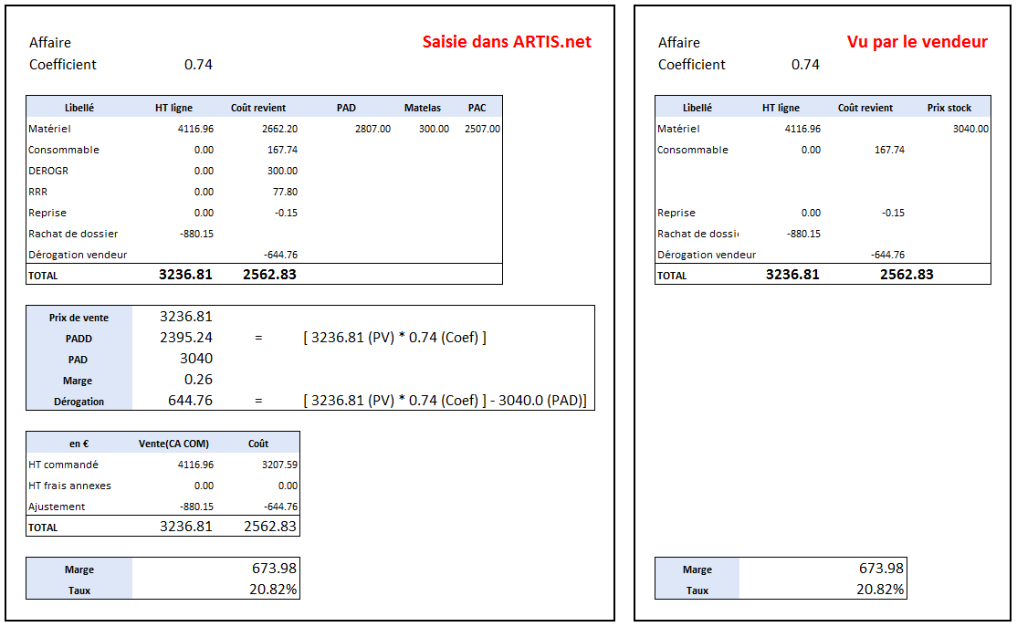 Si le taux de marge n'est pas atteint, une dérogation est calculée pour compenser l'écart afin de satisfaire le coefficient donné. La dérogation diminue les coûts de revient, augmentant ainsi la marge commerciale. Cette dérogation est prise sur le budget de dérogation.