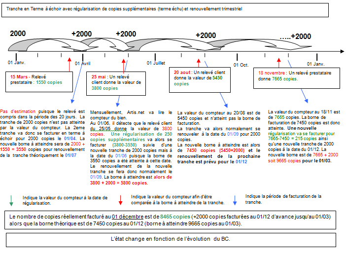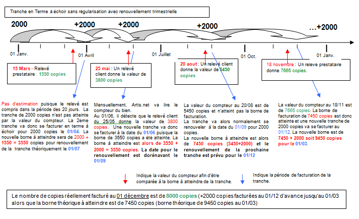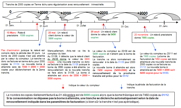 Cette règle facture périodiquement (par la date de renouvellement) et dès le 1er jour du contrat un nombre déterminé de copies. Prenons, comme exemple, une tranche renouvelable trimestriellement en terme à échoir commençant au 01 janvier. La facturation se déclenchera donc le 01 janvier pour ensuite se facturer périodiquement tous les trimestres à moins que la valeur du compteur ne dépasse la borne à atteindre et qu’une nouvelle tranche se déclenche avant échéance.