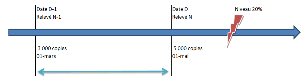 Un niveau d'encre remonté qui passe au-dessus d'un certain seuil indique un changement de consommable, consulter le paramètre "DELTA_ALERTE_NIVEAU_ENCRE". Chaque niveau d'encre qui sera considéré comme correspondant à un changement de toner sera identifiée et la durabilité constatée y sera associée.
