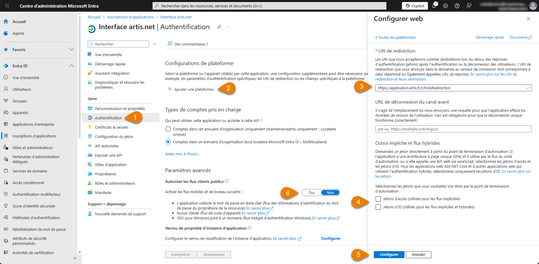 le champ Activer les flux mobiles et de bureau suivants.Pour le SSO, s’il est prévu que les applications smartphone artis Mobilité et/ou artis CRM s’authentifient aussi via Microsoft Entra :