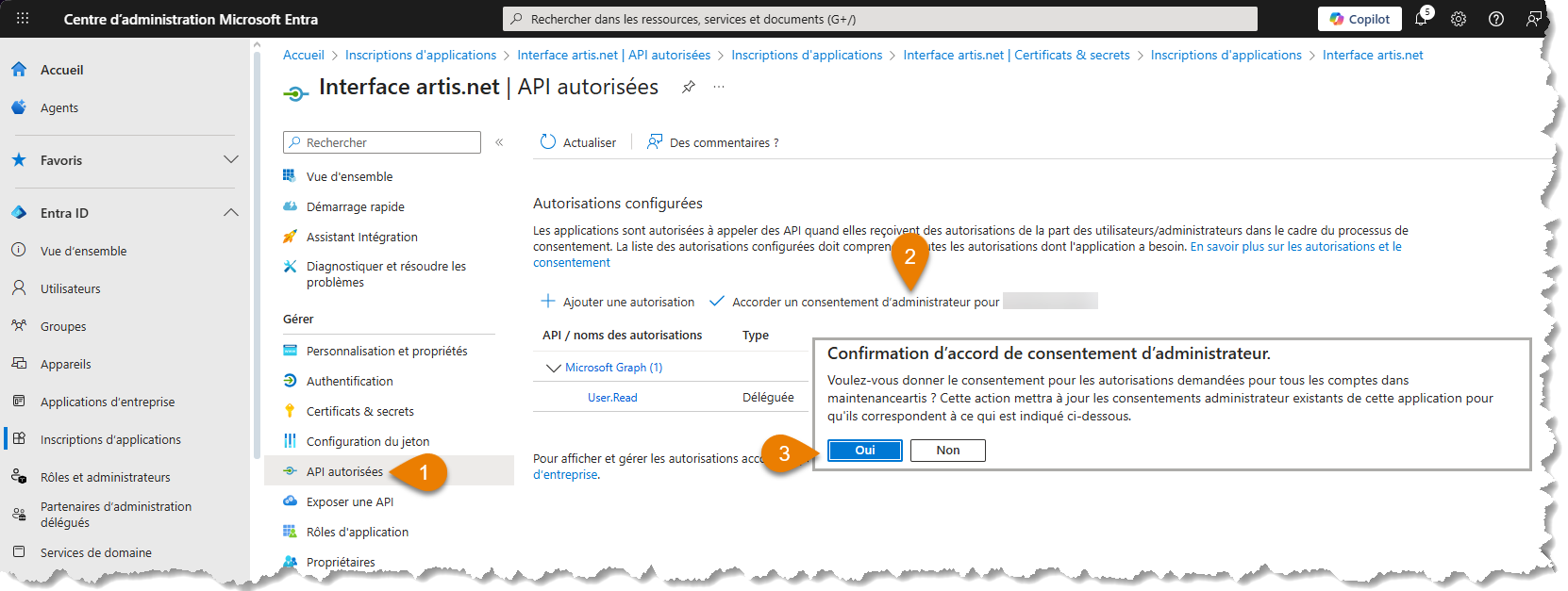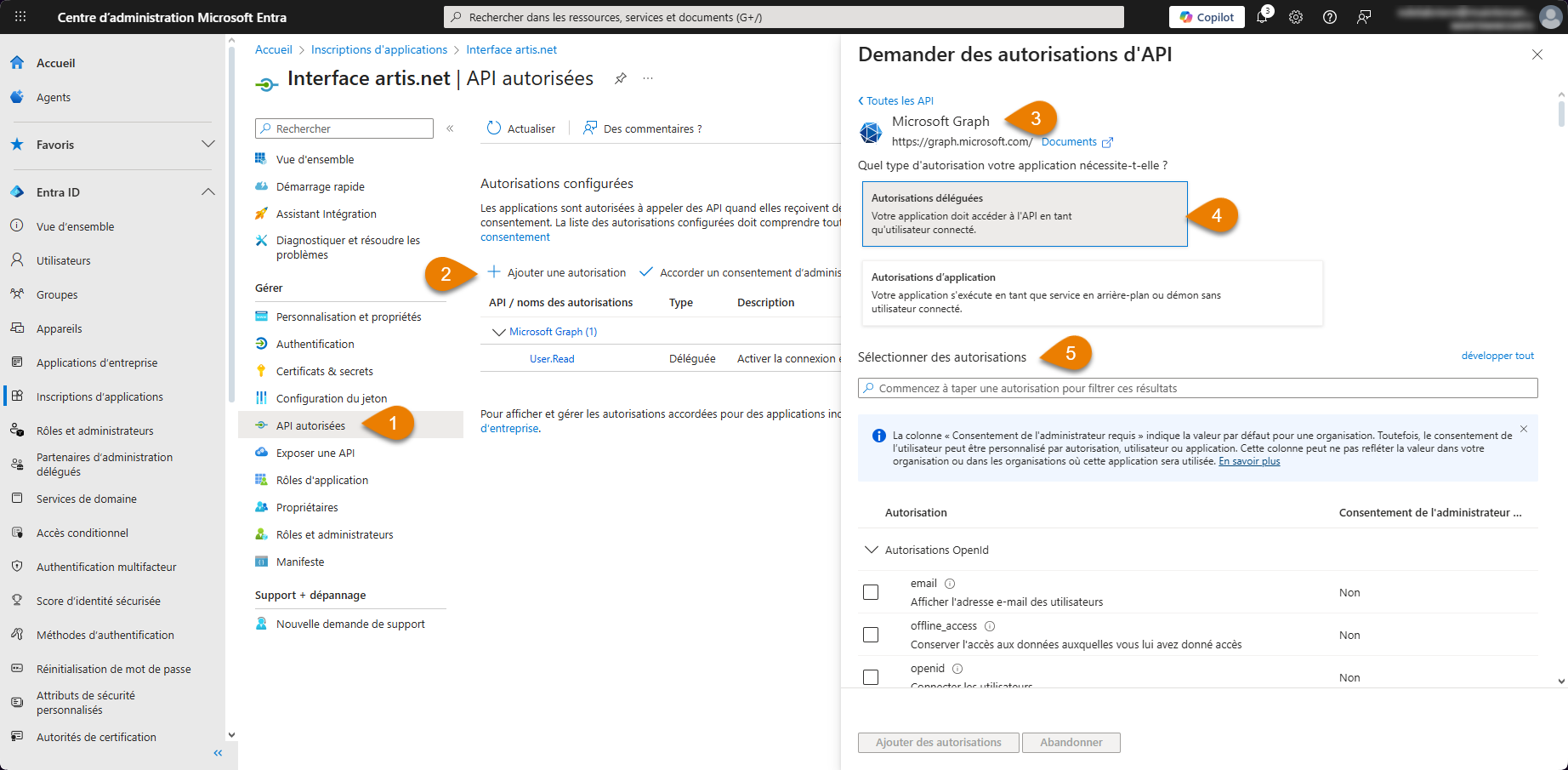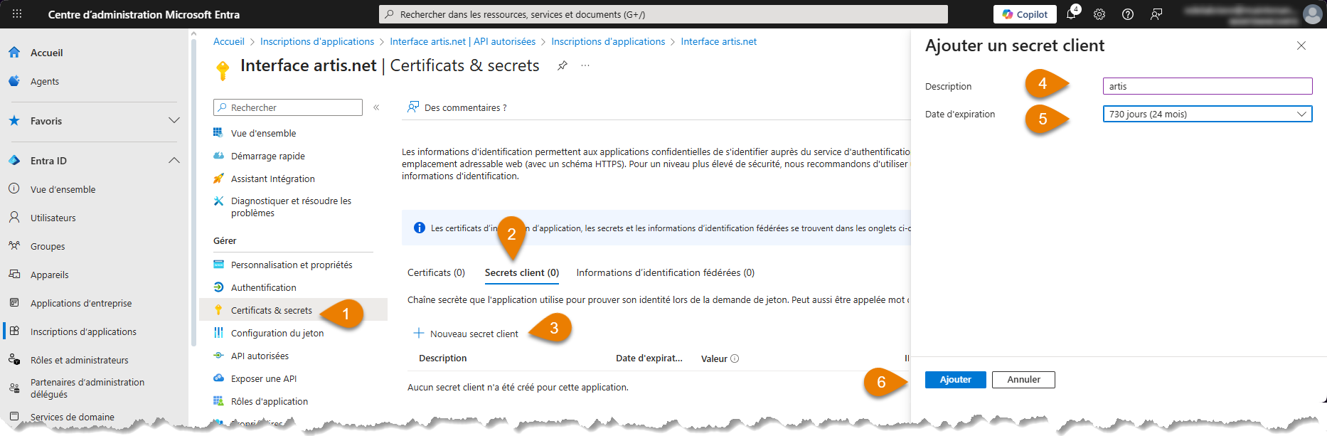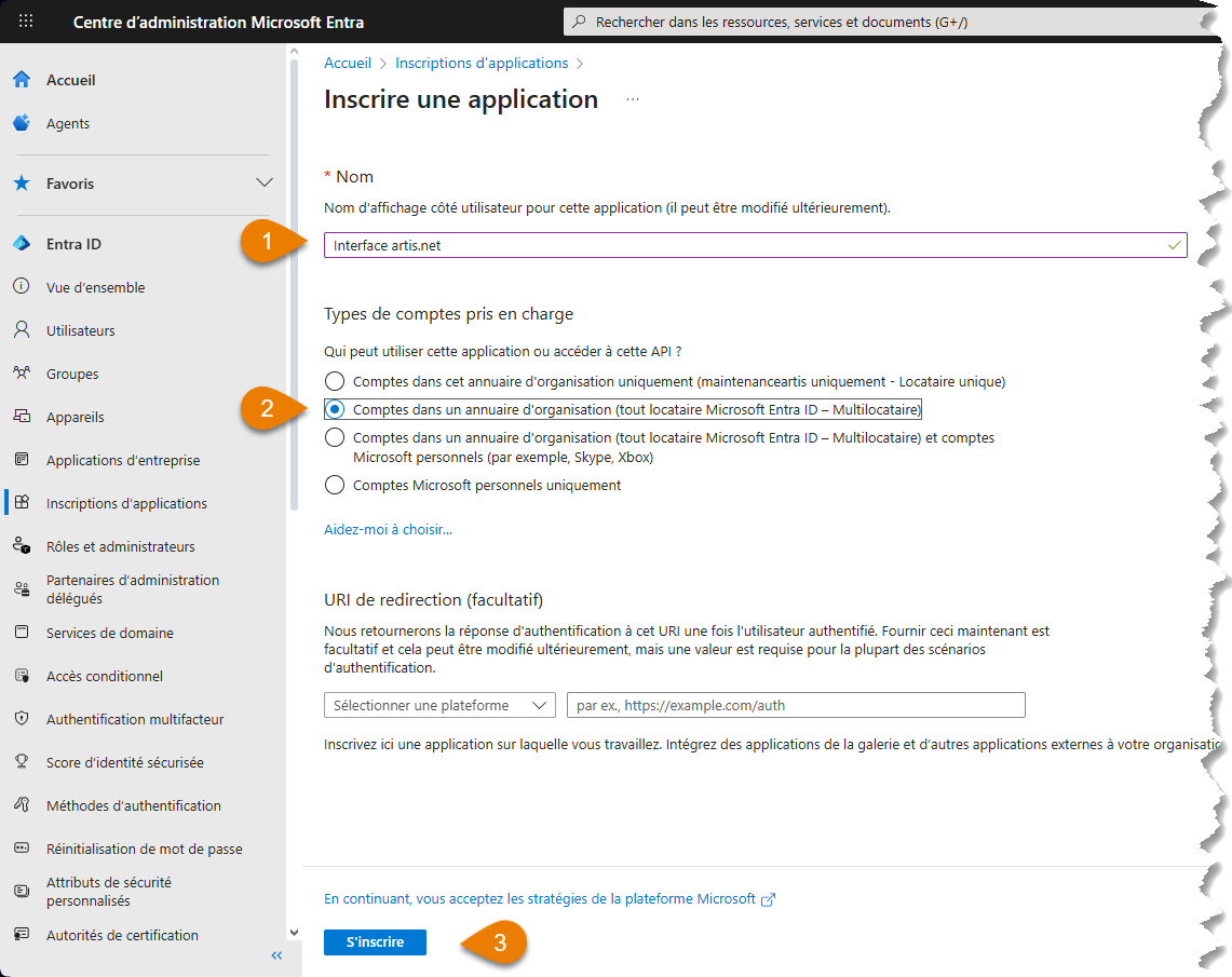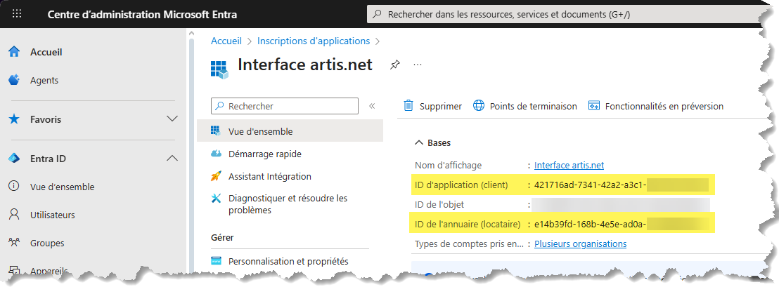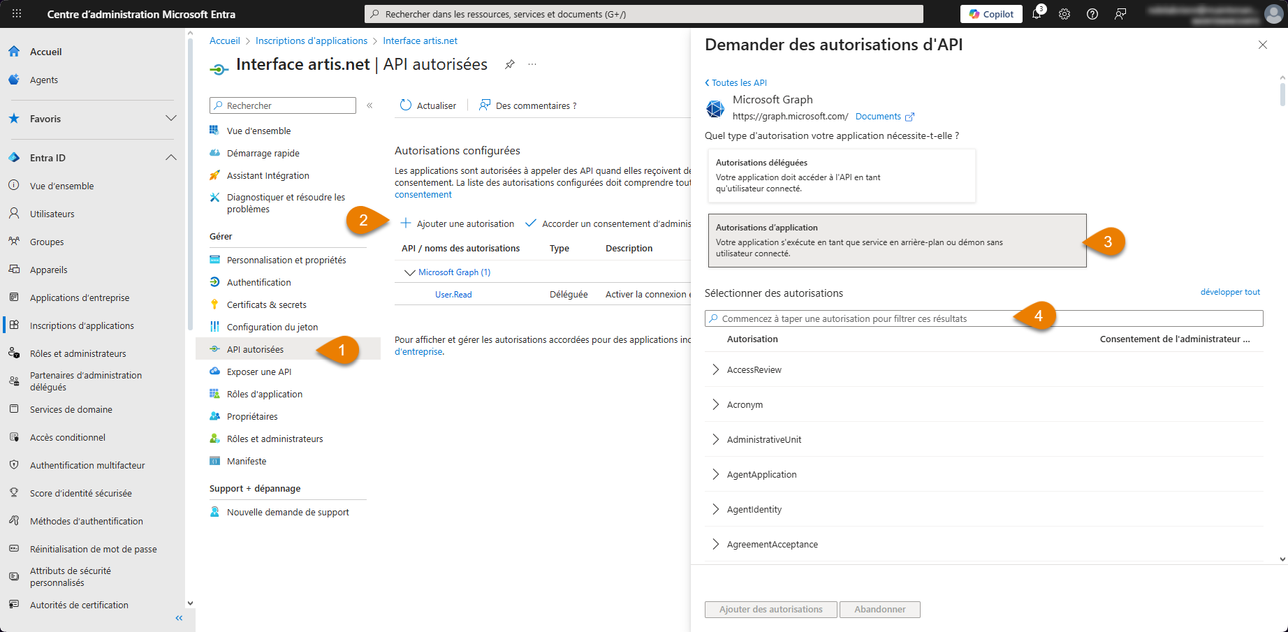 Pour mettre en place une interface Microsoft 365 avec artis.net, il est nécessaire d’inscrire cette dernière sur le Centre d’aministration Micosoft Entra (anciennement Azure AD).