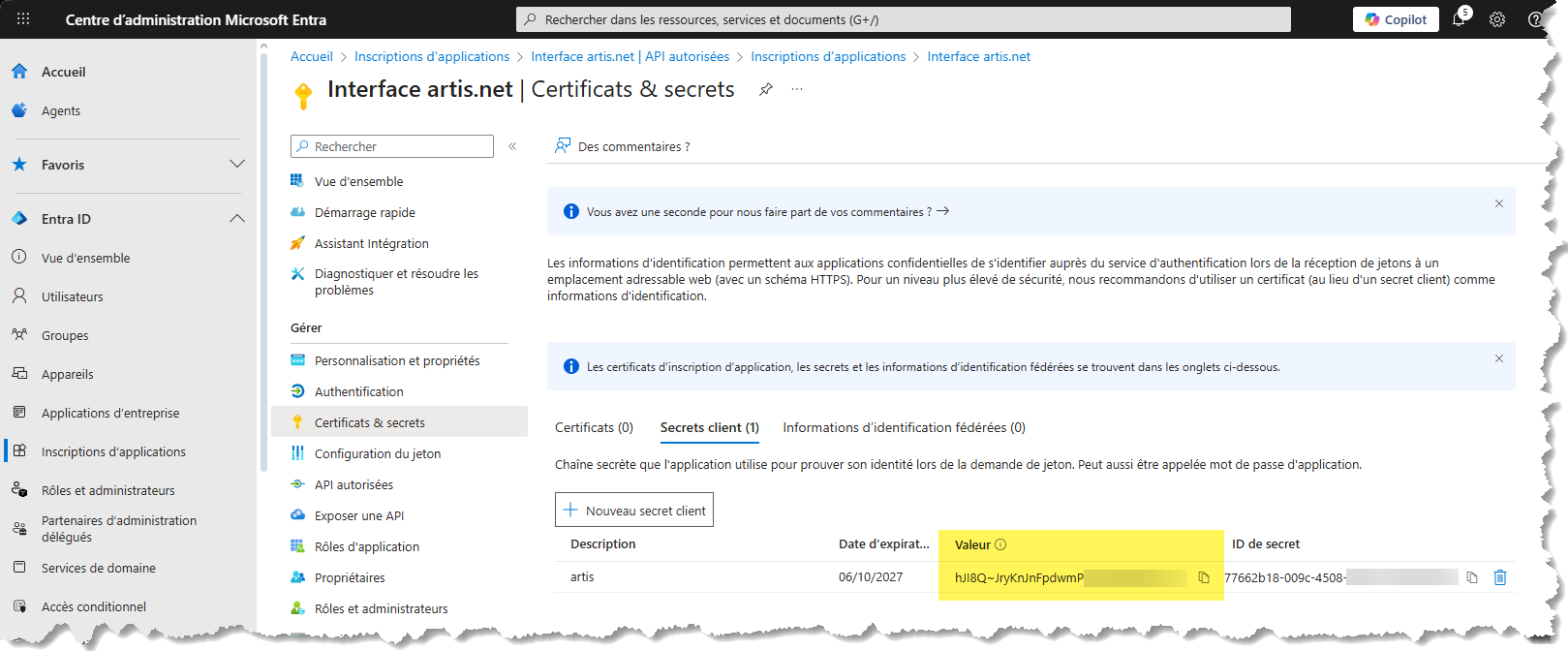 exemple de format tel qu’imposé par Microsoft :fa2do2f-2e2-2ae2-2f22-c22a222d2222La valeur du secret de l’application (et non l’ID du secret) :