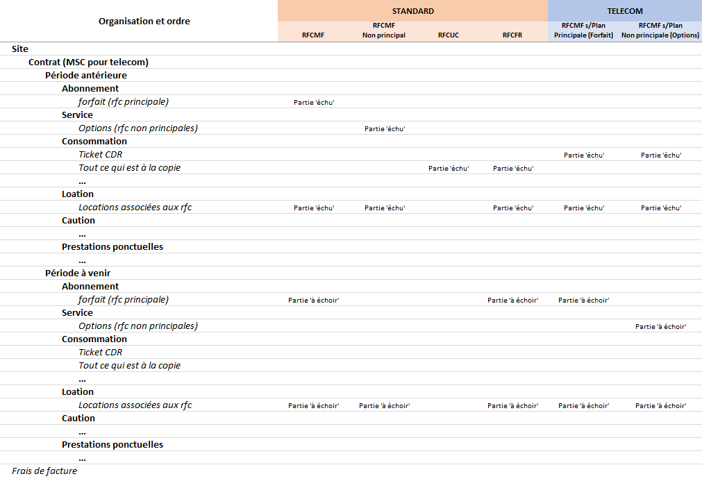 Considérant une SSC à jour dans sa facturation, selon le mode de facturation d’une RFC et ses caractéristiques (partie échue et à échoir), les éléments facturés se rangeront ainsi :